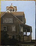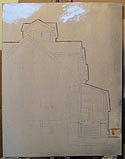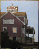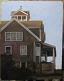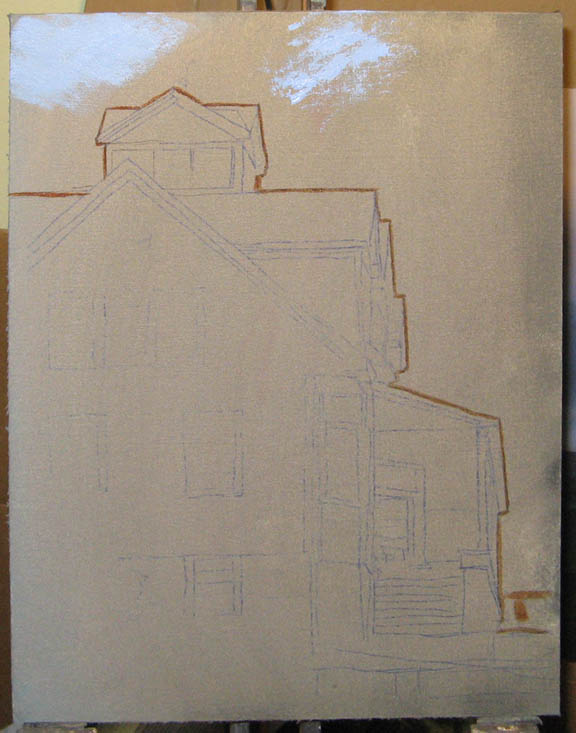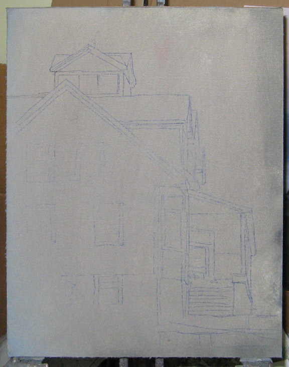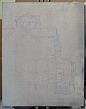 | This is painted from a digital photo and heavy alterations were done to the composition during the sketching phase; I moved the roof lines a bit and straightened up the perspective. If you want to see the original digital please ask. For this composition I started with a 14x11 canvas and washed it with the crud at the bottom of my thinner jar and allowed to dry for a day. I then layed my drawing over the canvas and transferred on the drawing with carbon. Its very important to work through compositional problems during the drawing phase as there is nothing worse than trying to fix the location of a building once you have paint transitions done. |  |