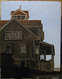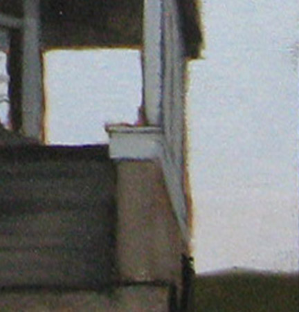 | I mixed up basically two dark tones (brown version and blue version). Both were painted on very thinly and no concern was made for actual value other than it being darker than reality. I used the brown darks for building forms that were not white and the blue version for white parts (window molding, roof lines, etc). The part of the building that is in the sun got a second layer of burnt sienna to lighten and warm it up a bit. The darkest areas got black - either tube or mixed. |  |
