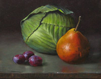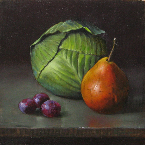 Still life with Cabbage, Pear, and Grapes (2010) Size: 15 x 15 cm; canvas board; Price: $155